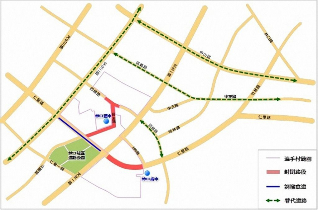 新北市交通局表示,林口選手村周邊交管從8月12日至9月2日長達22天,除民治路全線及仁愛路、四維路部分路段封路,仁愛路從文化一路到文化二路間調撥車道並有轉向管制,林口市區主要道路禁止15噸以上大貨車通行。
