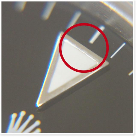 正品的夜光塗料充分且均勻,反觀仿品,夜光塗料較少,且有塗料溢出 。