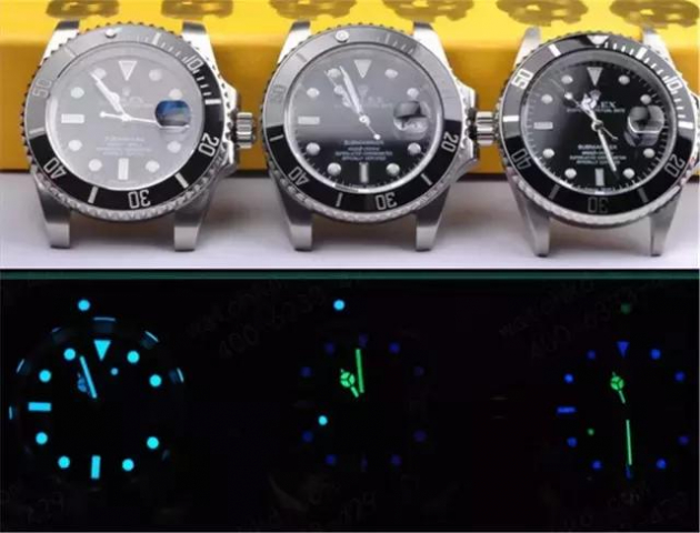 最左邊為正品,中間及右邊為仿品,可看出夜光質料上明顯的落差。