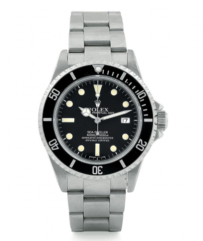 ↑ 1967年編號Ref.1665的初代Sea-Dweller誕生。裝配Cal.1575自動上鍊機芯,防水500米/1650英尺,之後提升到610米/2000英尺。具備了當時算是革命性的自動排氦氣閥,可以適用於呼吸氧氣混合氣的環境,初期不對民間銷售。面盤上有著紅色SEA-DWELLER及SUBMARINER2000字樣,藏家間暱稱「雙紅」。
