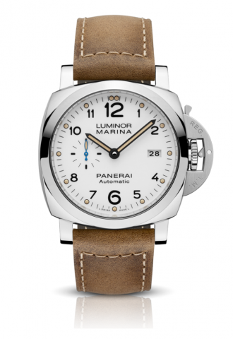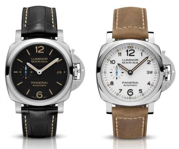 這二款手錶被認為是沛納海的「萬年入門款」,其系列名稱為Luminor Base Logo Acciaio – 44mm(Acciaio 是義大利文的鋼)。PAM01000只有時、分針;PAM01005則擁有小秒針,其最吸引人的部分是面盤上印有沛納海的「閃電logo」,尺寸適中,同時價格最為平易近人。也因為它採用的是ETA通用機芯、沒有三明治面盤,也沒有水晶透視底蓋,才能有最入門的售價。而沛納海為這二款手錶所做的改變,是把錶底蓋從原來的「旋入式」改為「壓入式」;防水從原本的300米降為100米;夜光塗料從填入改為塗印;錶帶更換系統則由外拆式改為彈簧式。所以,錶迷們在舊款與新款之間要選哪一個版本,得要趕緊做一個抉擇了。