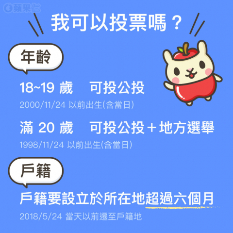 - 年紀:滿 (含)18 歲可以參與公投、滿 20 歲可參與地方選舉(縣市長、議員、里長等等)