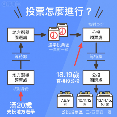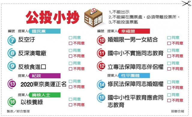 - 關於公投小抄:可以攜帶小抄,但不能出示小抄、不能把小抄留在圈票處(要帶出投票所)、不能投進票匭。