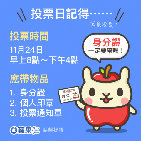 最後投票日除了注意時間外,大家還要記得攜帶身分證、個人印章、投票通知單喔